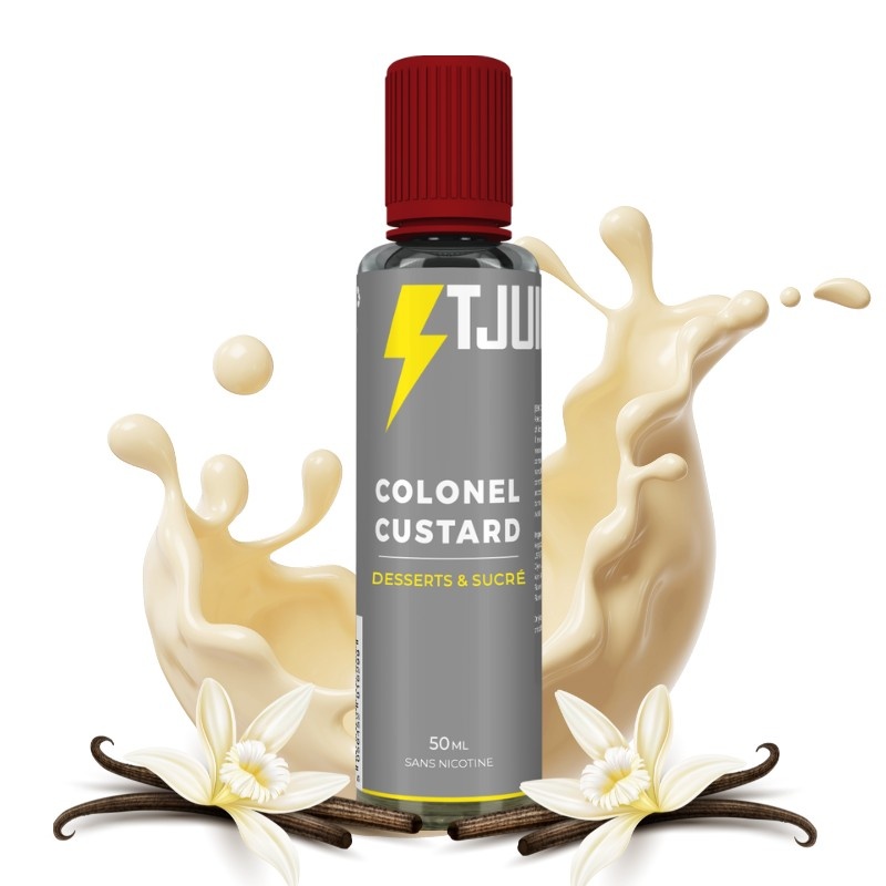 Découvrez l'e-liquide Colonel Custard T-Juice 50ml, une base aromatique associant crème, vanille et caramel dans un profil typé custard.