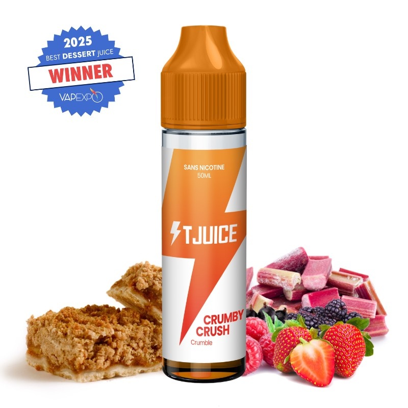 Découvrez l'e-liquide Crumby Crush T-Juice 50ml, une composition mêlant crumble, fruits rouges et une note de rhubarbe, sur un profil de type dessert.