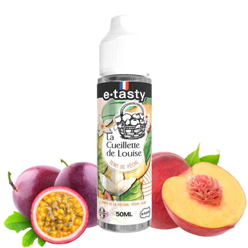 Succombez à l'e-liquide Teint de Pêche de La Cueillette de Louise par E.Tasty, un mélange rafraîchissant de pêche jaune et de fruit de la passion. Parfait pour ceux qui cherchent une vape fruitée et douce avec leur cigarette électronique, ce jus apporte une explosion de saveurs estivales idéales pour une journée ensoleillée.