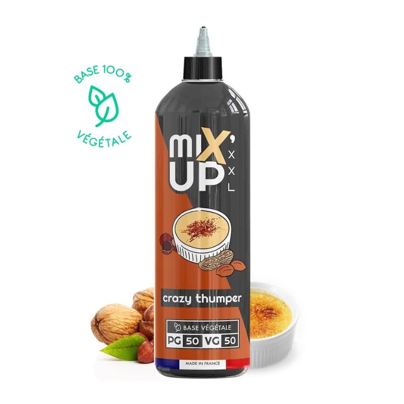 L’e-liquide Crazy Thumper MIX’UP XXL est disponible en format 1L, sans nicotine. Une recette mêlant des notes de crème brûlée, cacahuètes et noisettes, idéale pour une vape personnalisable.