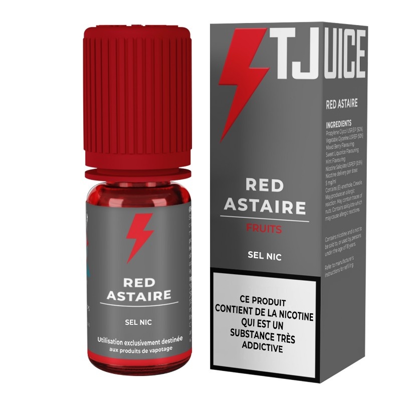 Disponible en 10 ml, l’e-liquide Red Astaire T-Juice Nic Salts est proposé avec deux taux de sels de nicotine :